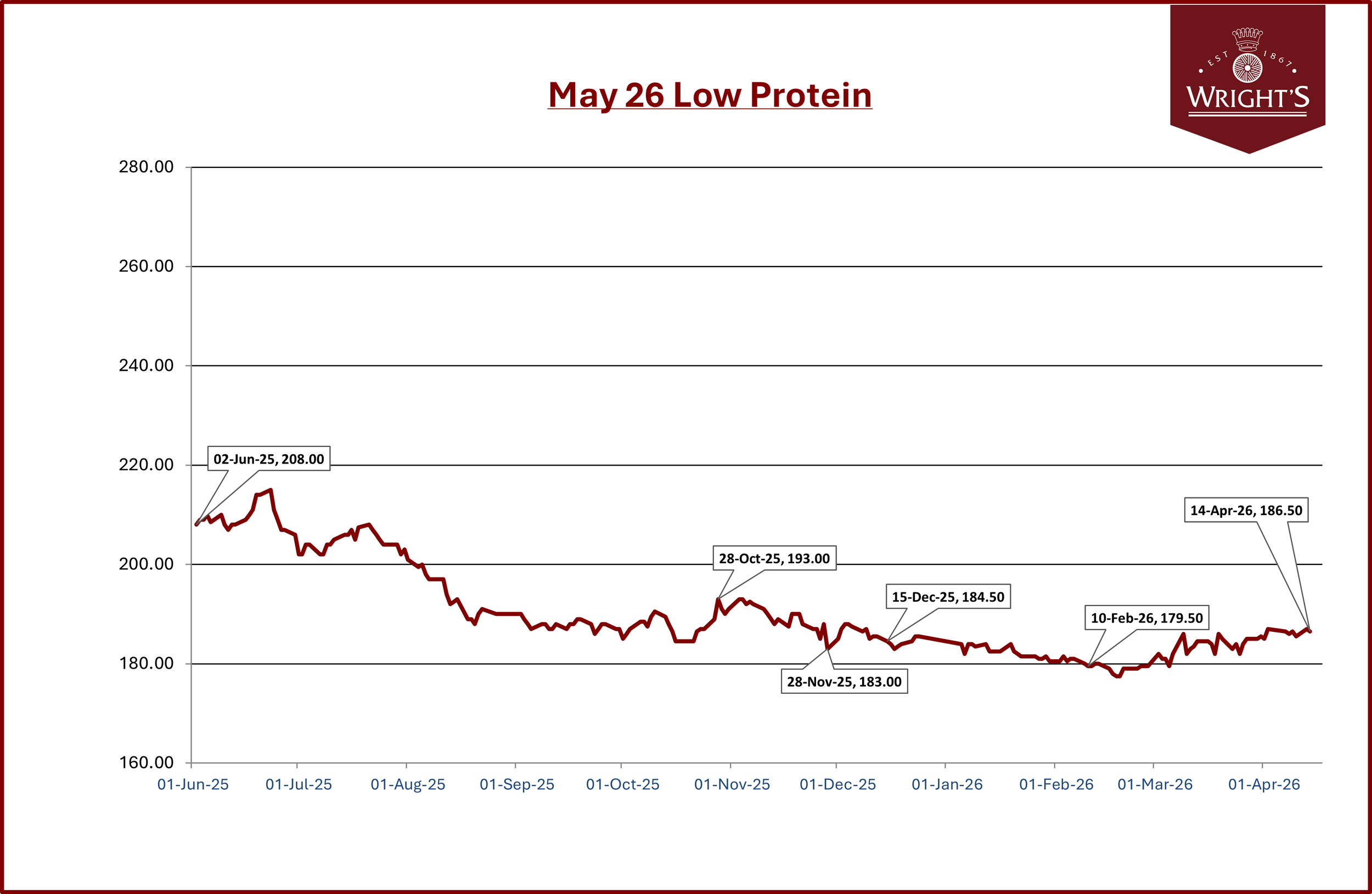 Winter wheat crops in the US remain in poor condition, with only 35% rated good/excellent, although rains are forecast which has put pressure on Chicago wheat futures. Russian production for harvest 2026 has been revised up from 86.5 million tonnes to 88.7 million tonnes by analysts at Argus, due to a higher planted area and improved yield prospects